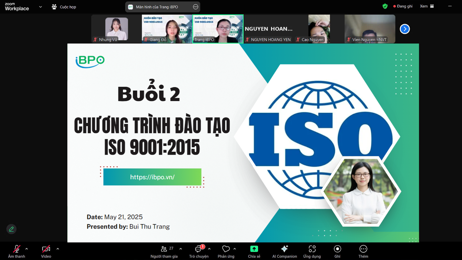 Hà Nội, ngày 21/5/2025 – Tiếp nối thành công của buổi đào tạo đầu tiên, iBPO tiếp tục tổ chức buổi 2 trong chuỗi chương trình đào tạo ISO 9001:2015 với hình thức trực tuyến qua Zoom. Buổi học do Giảng viên Bùi Thu Trang – Trưởng nhóm tư vấn iBPO – đảm nhiệm xuyên […]